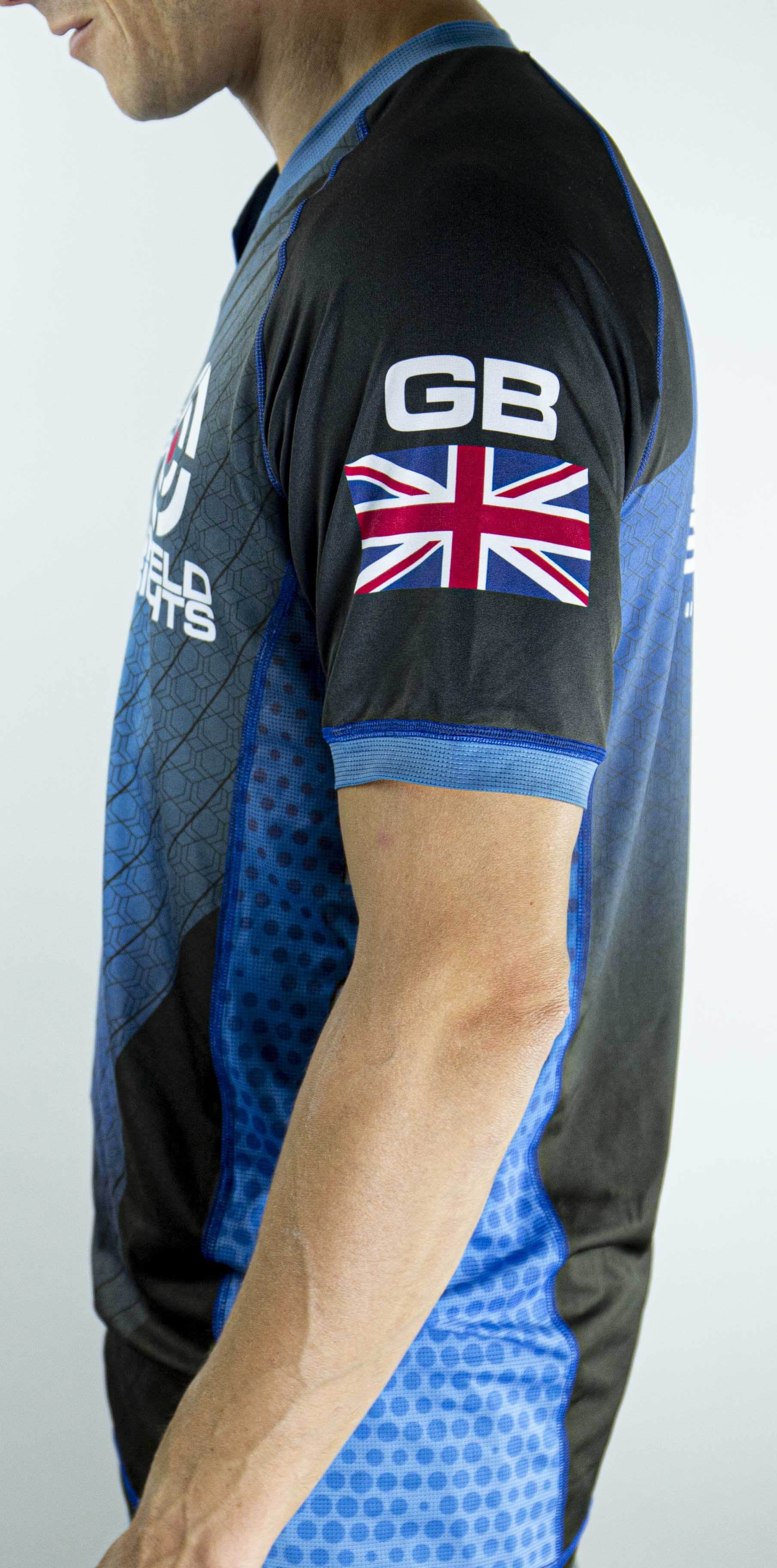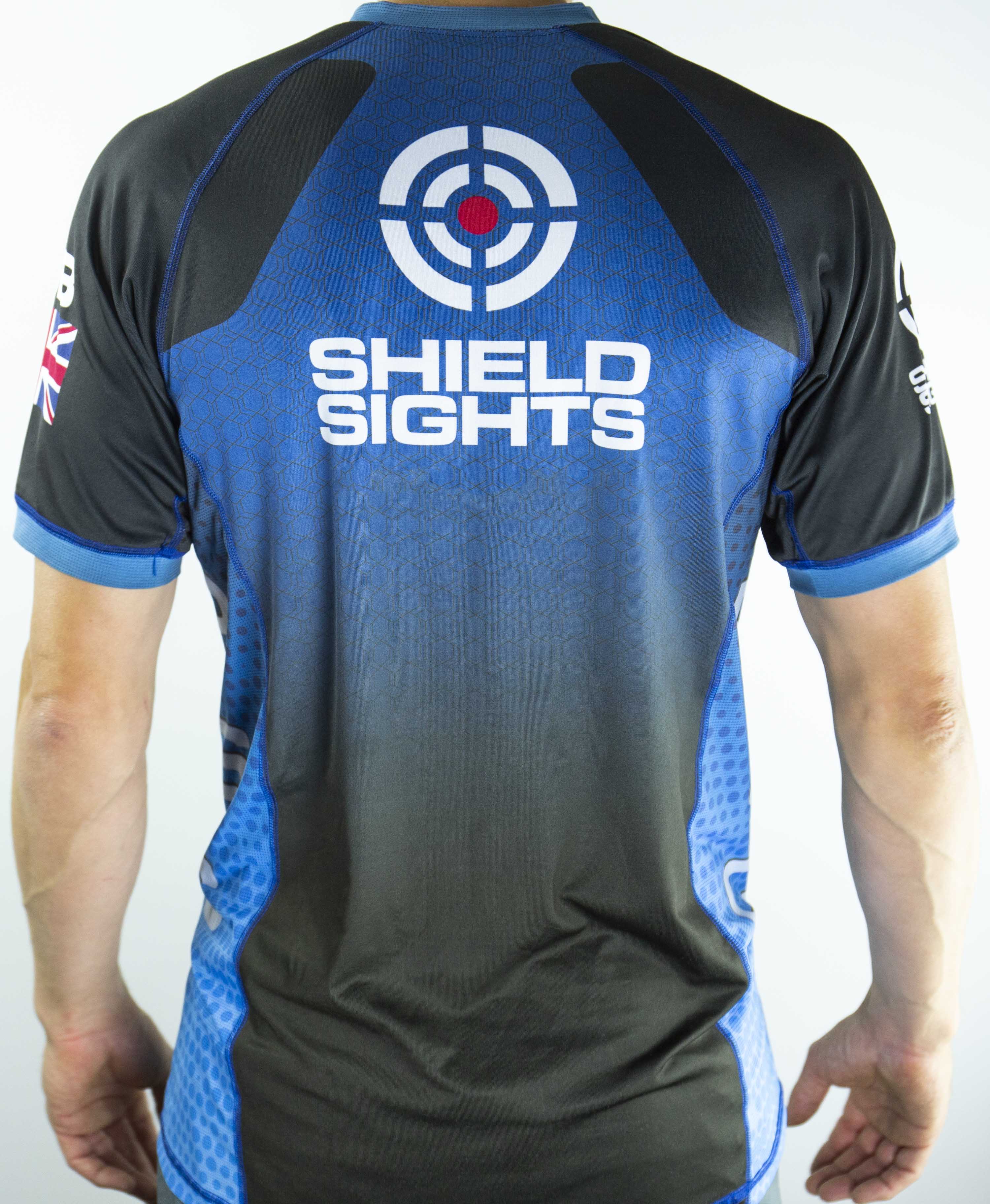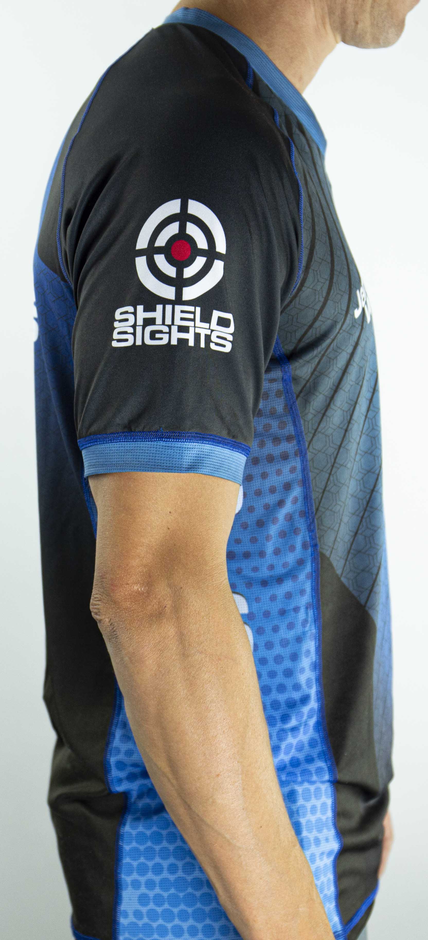 High-Quality Shield Sights Shooting shirt for IPSC in Blue.