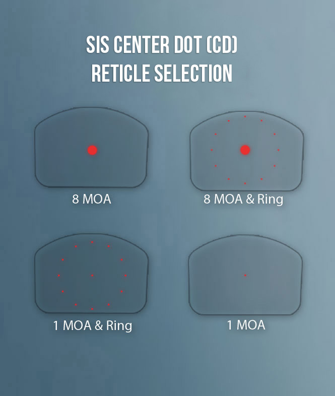 - Red Dot Size Options: SIS-CD (Multi-Reticle Version 2MOA, 2MOA + 65MOA Ring, 8MOA, 8MOA + 65MOA Ring).